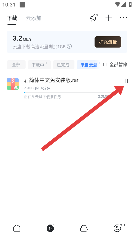 2、在下載任務的列表中,我們需要找到正在進行的下載任務,然后點擊任務右側的暫停按鈕。
