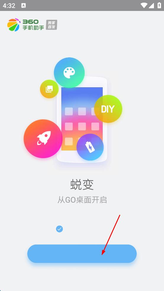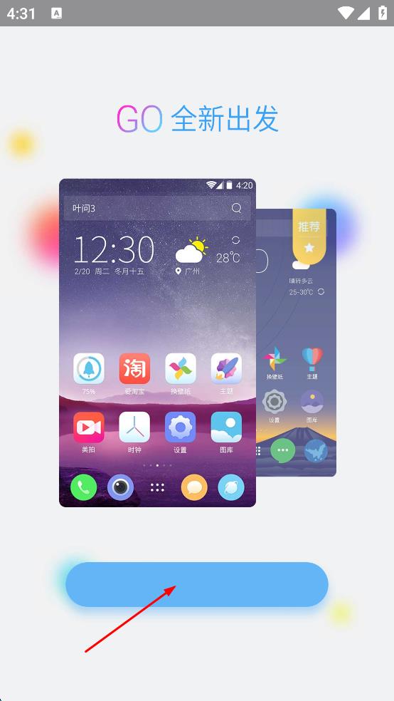 1、打開GO桌面應(yīng)用,在“GO 全新出發(fā)”頁(yè)面點(diǎn)擊藍(lán)色按鈕,進(jìn)入“蛻變 從GO桌面開啟”頁(yè)面,再次點(diǎn)擊藍(lán)色按鈕。