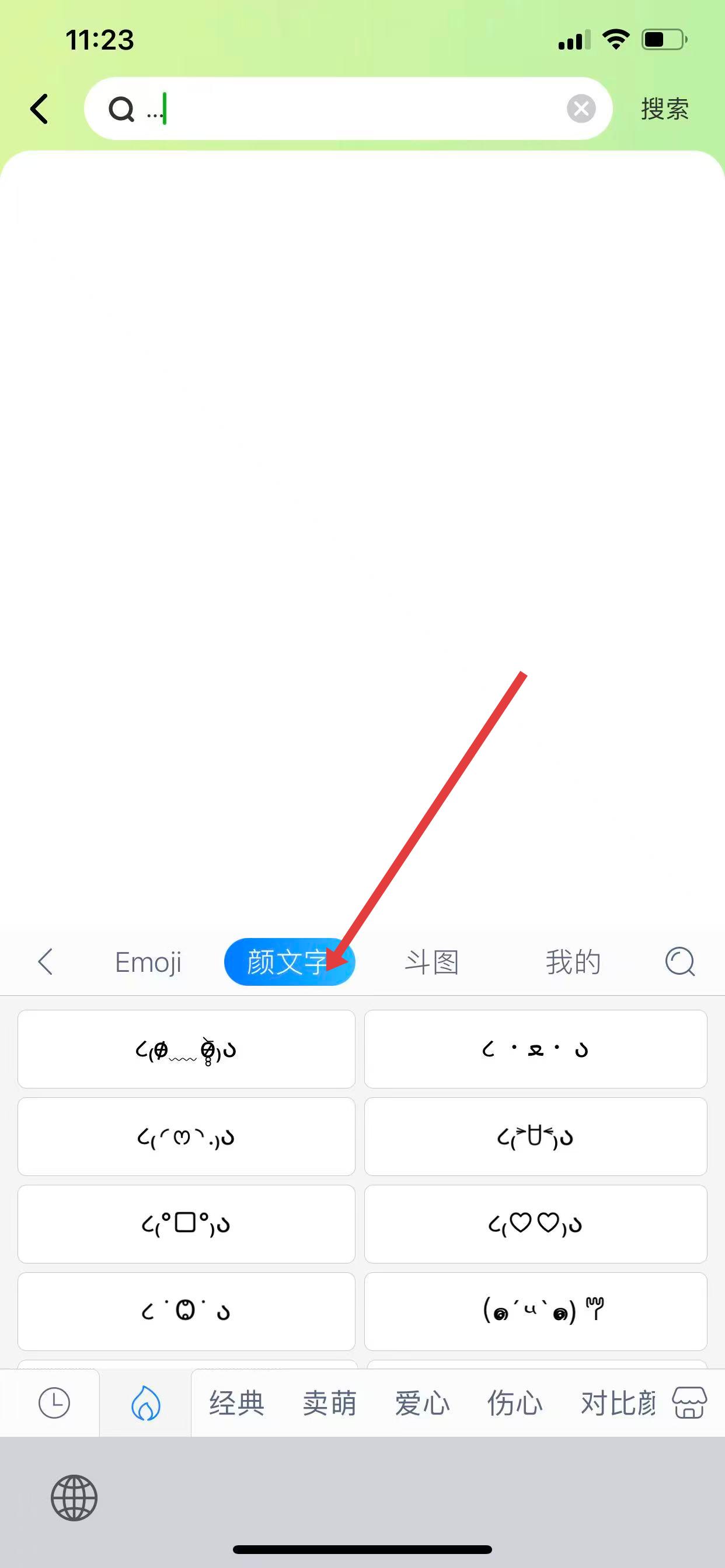 2、進入表情界面后,點擊頂部的顏文字選項卡,即可查看各種分類的顏文字。