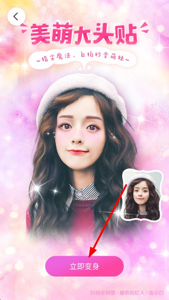 2、進(jìn)入美萌大頭貼界面后,點(diǎn)擊下方醒目的立即變身按鈕,準(zhǔn)備拍攝。