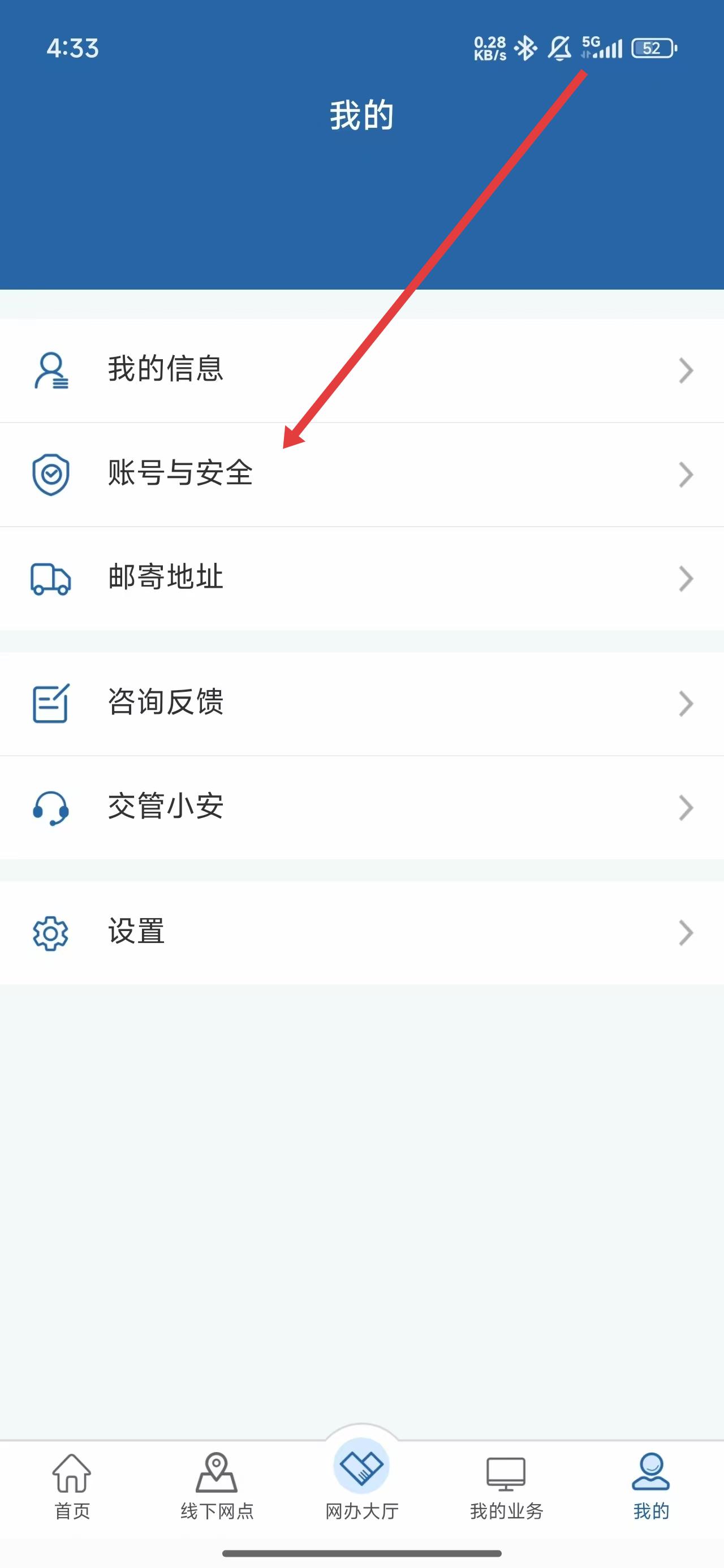 2、在我的頁面中,點擊賬號與安全按鈕進入設置。