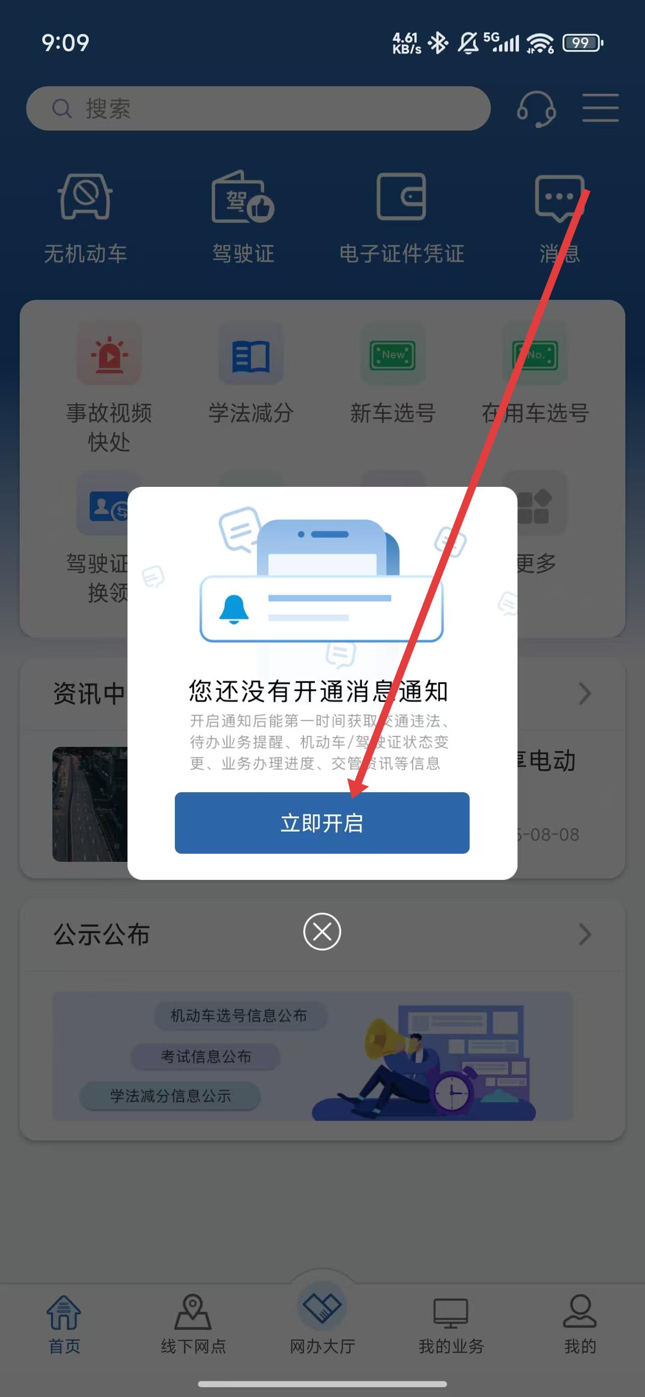 3、在進(jìn)入到交管12123APP內(nèi)時(shí),可點(diǎn)擊彈窗中的立即開啟按鈕,開啟消息通知。