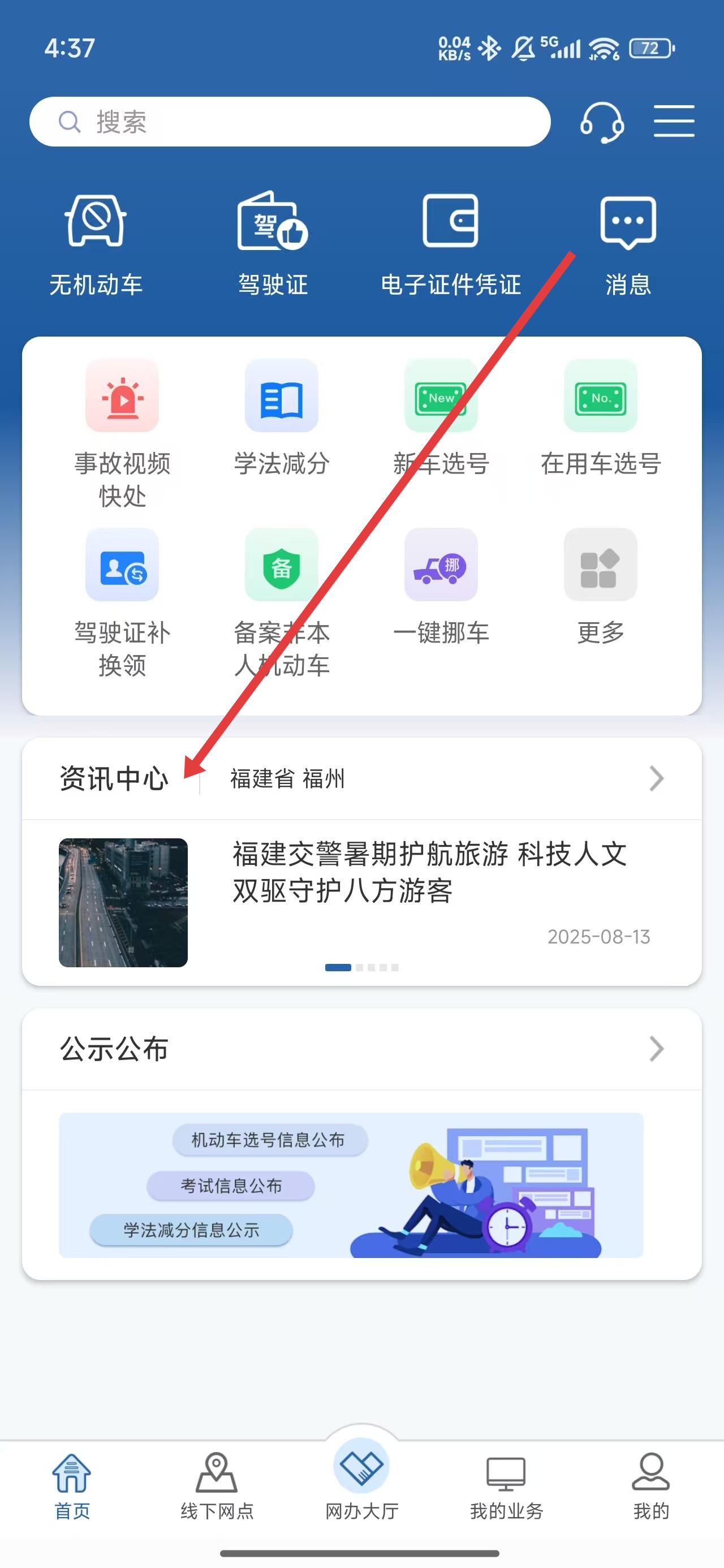 1、點擊交管12123首頁下的資訊中心區(qū)域,進入查看最新資訊。