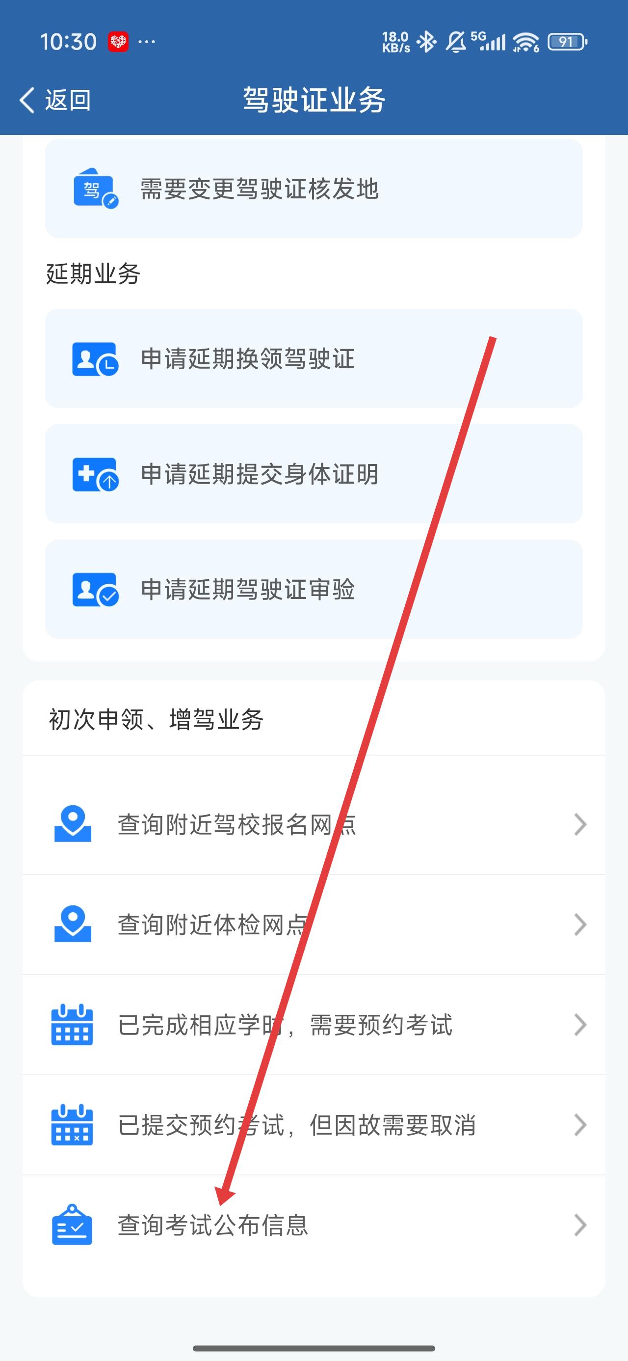 2、在進入到駕駛證業(yè)務頁面中,可以點擊查詢考試公布信息選項,進入查詢。