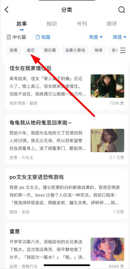 3、進(jìn)入故事頁面后,點(diǎn)擊分類篩選,選擇如虐戀等小說類別,瀏覽并選擇感興趣的小說閱讀。