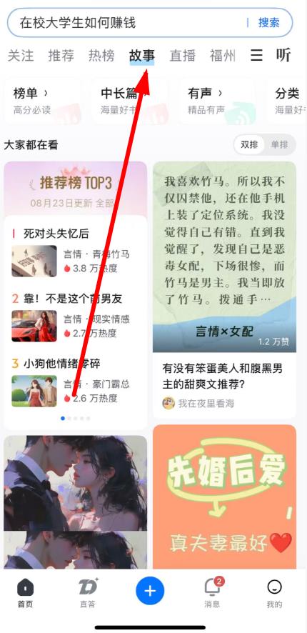 2、在首頁上方導(dǎo)航欄找到并點(diǎn)擊故事選項(xiàng)。