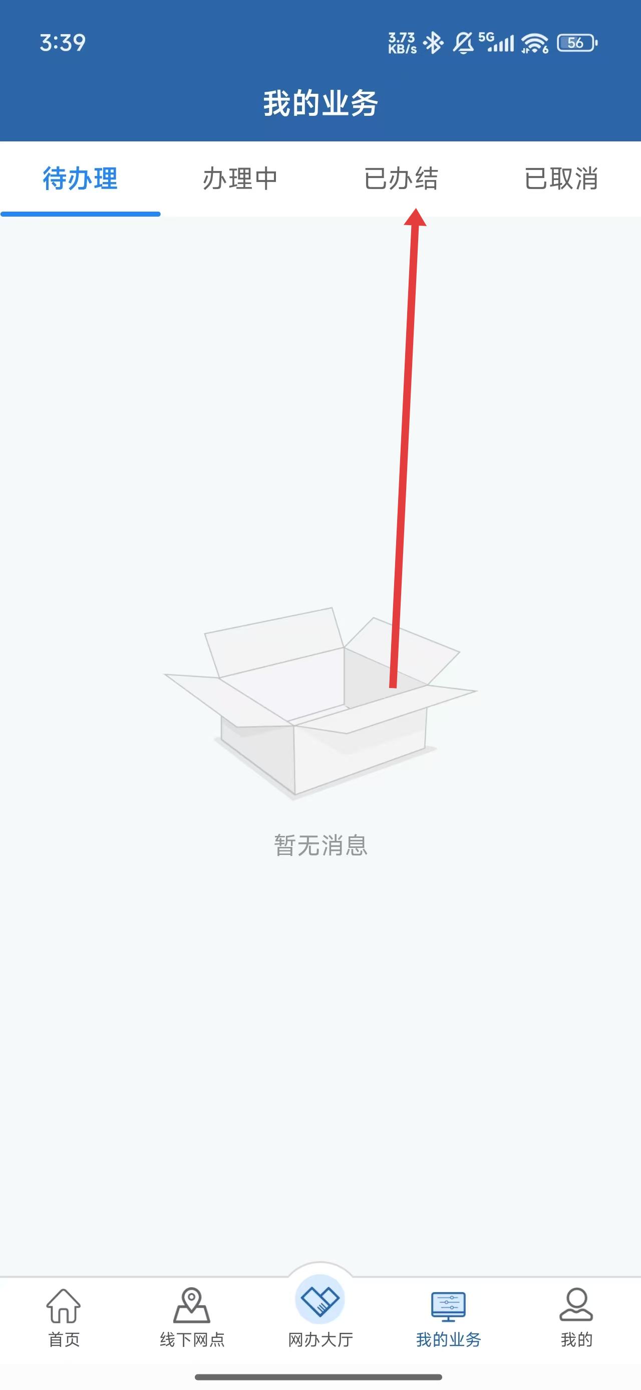 2、在進(jìn)入到我的業(yè)務(wù)頁面時,可點(diǎn)擊已辦結(jié)選項(xiàng),查看已完成的業(yè)務(wù)信息。
