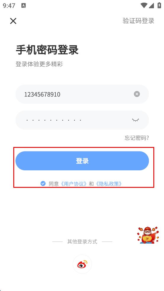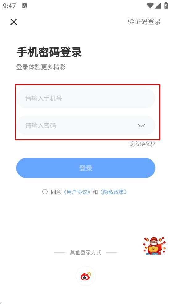 3、在登錄界面,選擇手機(jī)密碼登錄方式,依次輸入手機(jī)號(hào)和密碼,完成信息填寫。