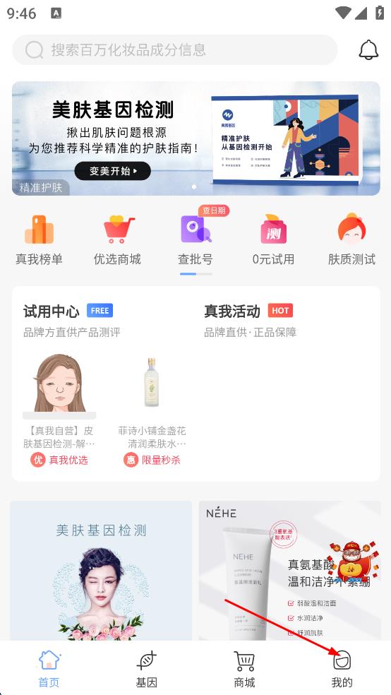 1、打開美膚類軟件,進(jìn)入首頁后,點(diǎn)擊頁面右下角的“我的”選項(xiàng),進(jìn)入個(gè)人中心頁面。