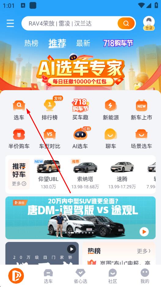 1、打開太平洋汽車App,在首頁點擊選車選項。