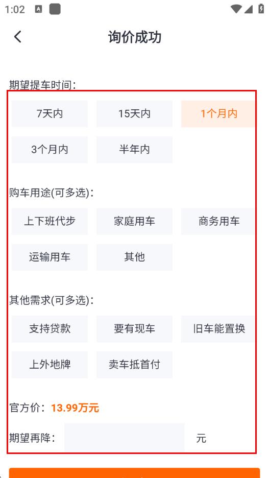 4、在詢價頁面填寫提車時間、購車用途等信息,等待經(jīng)銷商報價。