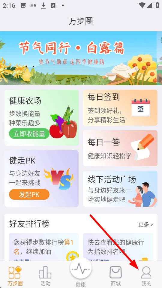 1、打開萬步健康A(chǔ)pp,點擊底部導(dǎo)航欄中的我的選項,進入個人頁面。