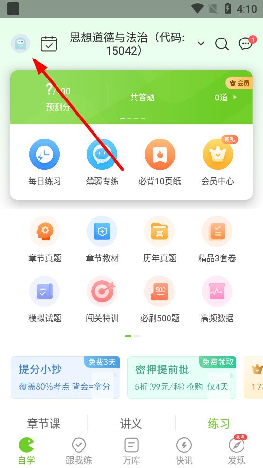 1、打開萬題庫應(yīng)用,點擊左上角的頭像圖標(biāo),進入個人相關(guān)界面。
