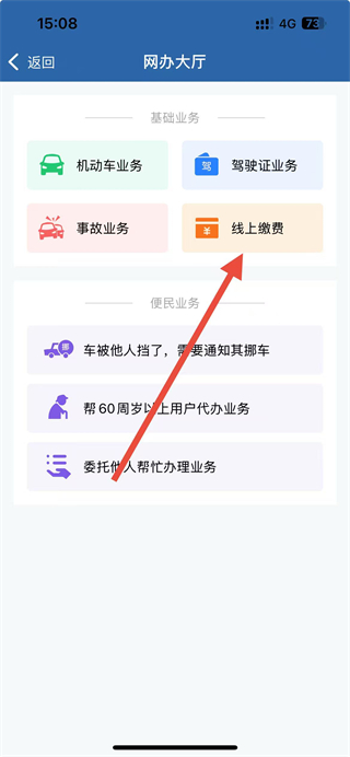 3、在線上繳費(fèi)頁(yè)面點(diǎn)擊繳納罰款選項(xiàng),進(jìn)入罰款繳納頁(yè)面。