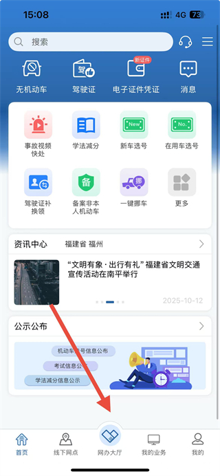 1、在交管12123app首頁(yè)點(diǎn)擊網(wǎng)辦大廳選項(xiàng),進(jìn)入網(wǎng)辦大廳頁(yè)面。
