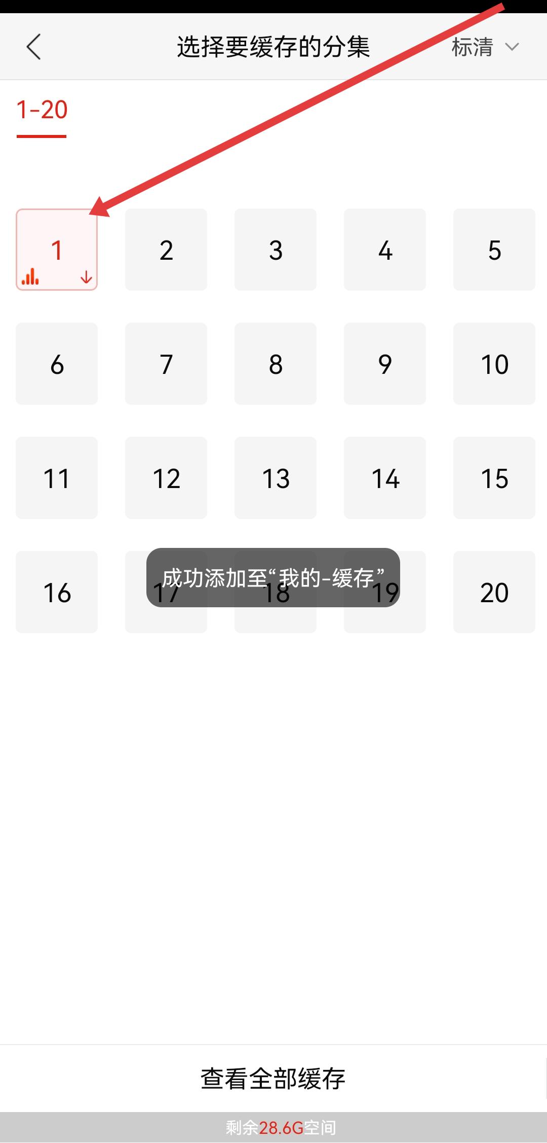3、在選擇要緩存的分集界面,點(diǎn)擊想要下載的集數(shù)如第1集,即可將該集添加至緩存,完成電視劇的下載操作。