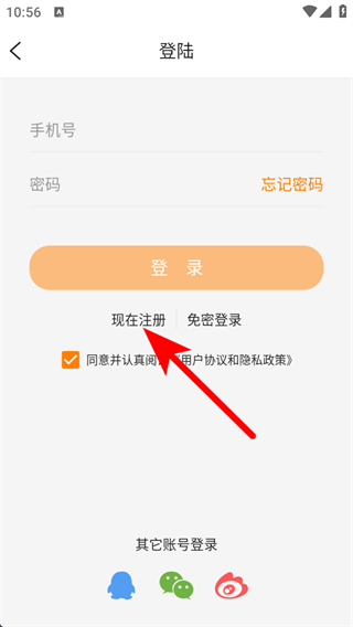 3、在登錄頁面,點(diǎn)擊現(xiàn)在注冊選項(xiàng),進(jìn)入注冊界面。