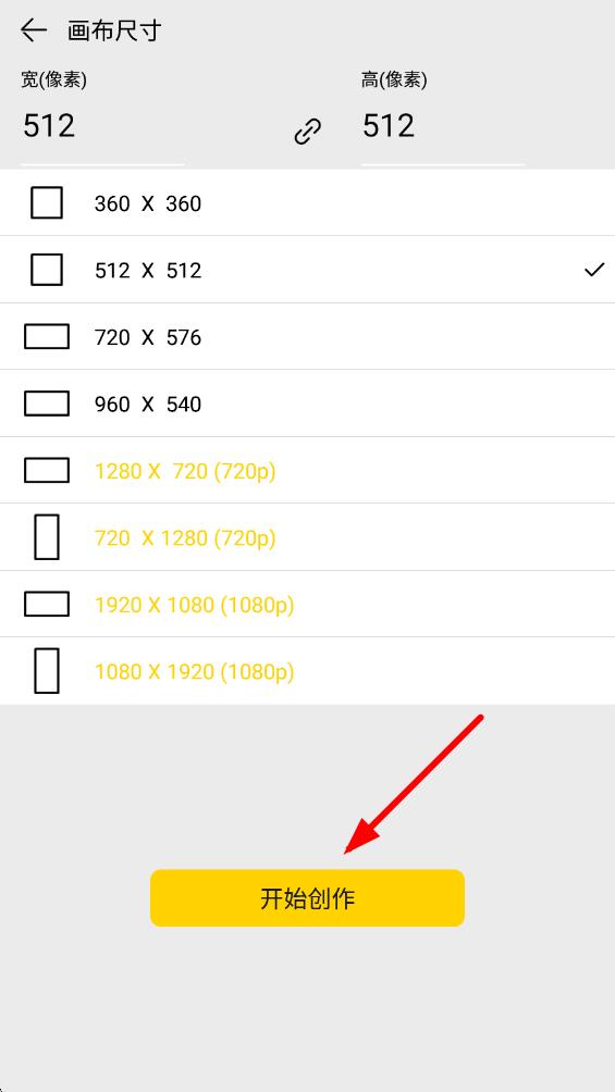 3、在動畫創(chuàng)作準(zhǔn)備頁面,設(shè)置畫布尺寸,比如選擇合適的寬高像素值,設(shè)置完成后點(diǎn)擊開始創(chuàng)作。