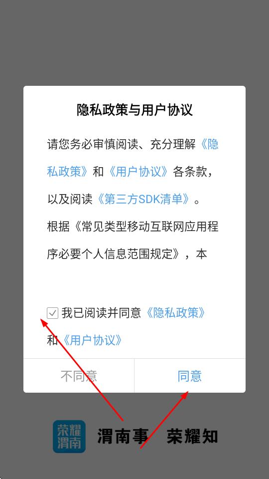1、打開榮耀渭南網(wǎng)APP,在彈出的隱私政策與用戶協(xié)議頁面,勾選我已閱讀并同意隱私政策和用戶協(xié)議,點(diǎn)擊同意。