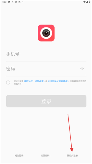 1、打開(kāi)和目攝像頭APP,若未登錄進(jìn)入時(shí)點(diǎn)擊下方新用戶注冊(cè)的按鈕。