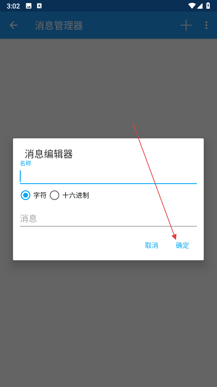 4、在消息編輯器中,選擇字符十六進(jìn)制模式,在消息輸入框中輸入要發(fā)送的內(nèi)容,輸入完成后點(diǎn)擊確定按鈕完成消息添加。