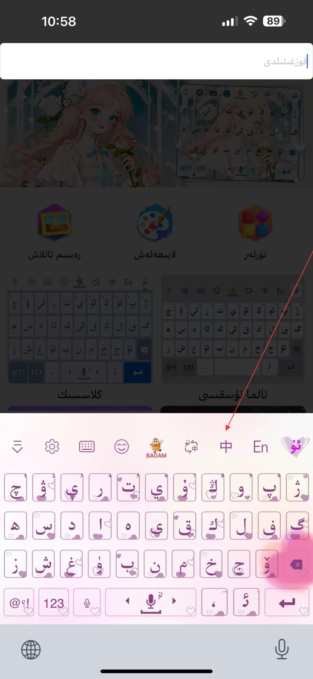 1、在維語(yǔ)輸入法界面,點(diǎn)擊上方類似中字樣的按鈕,切換輸入語(yǔ)言模式。