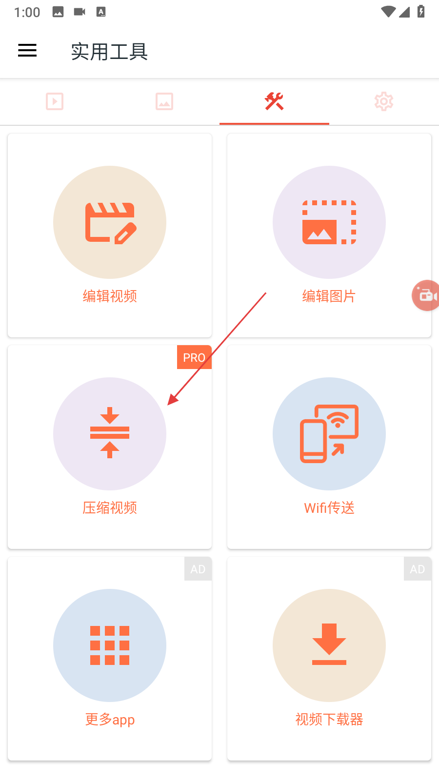 1、打開(kāi)AZ Screen Recorder,在實(shí)用工具界面點(diǎn)擊壓縮視頻選項(xiàng),進(jìn)入視頻選擇頁(yè)面。