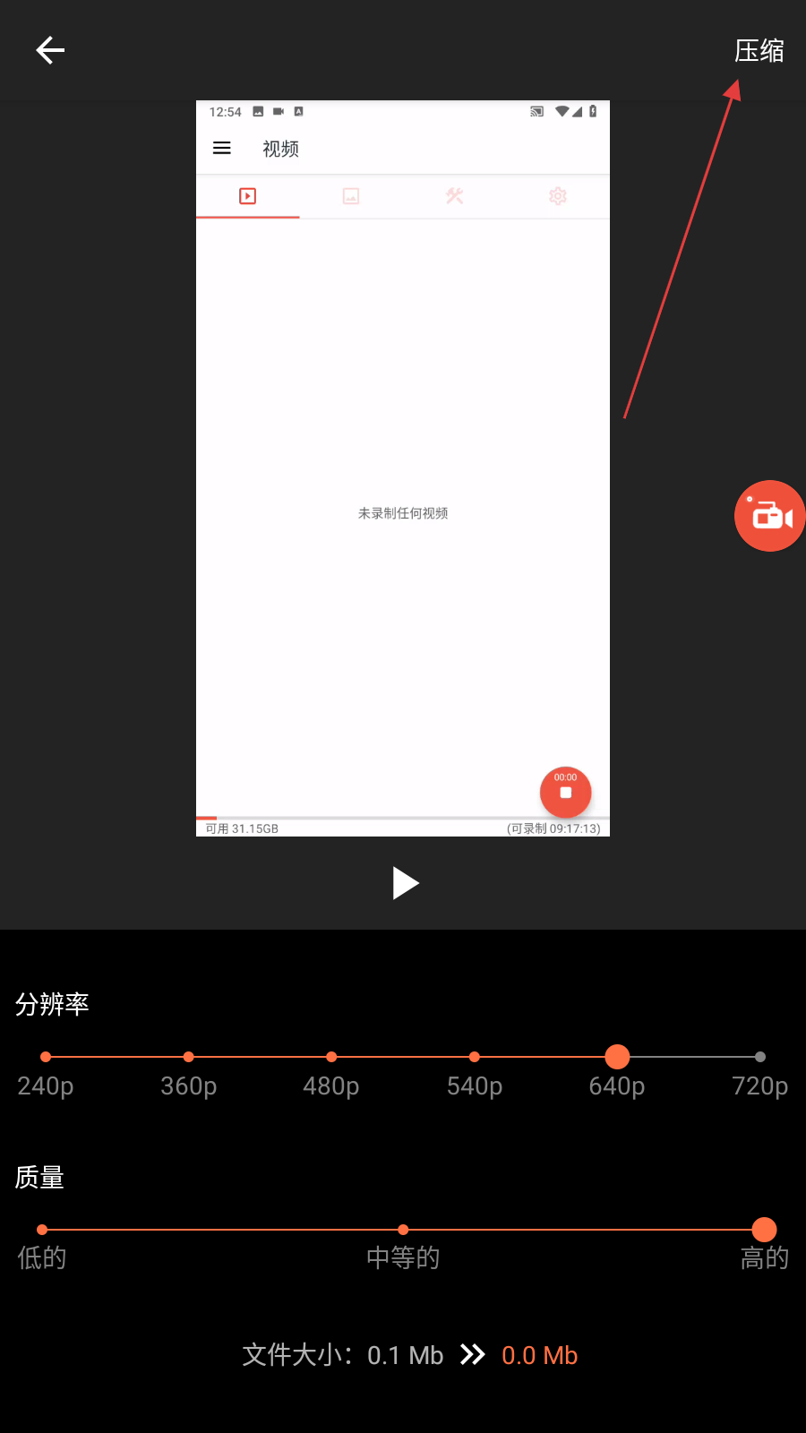 4、參數(shù)設(shè)置好后,點(diǎn)擊右上角的壓縮按鈕,等待壓縮完成,之后可在分享頁(yè)面選擇保存或分享壓縮后的視頻。