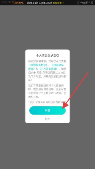 1、打開映客直播APP,首屏?xí)棾鰝€人信息保護指引彈窗,點擊同意即可。