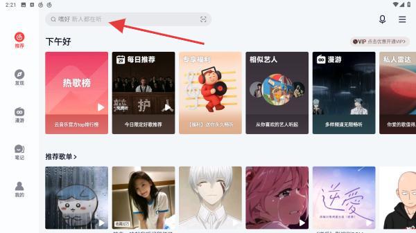 1、啟動(dòng)動(dòng)網(wǎng)易云音樂APP,點(diǎn)擊首頁頂部搜索欄,位于界面上方的輸入框區(qū)域。