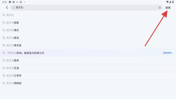 2、在搜索框中輸入歌手名字,如周杰倫,輸入過程中會(huì)出現(xiàn)聯(lián)想推薦,確認(rèn)后點(diǎn)擊鍵盤上的搜索按鈕。