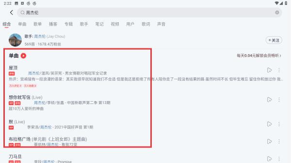 3、搜索結(jié)果頁默認(rèn)顯示綜合分類,下滑找到單曲板塊,即可看到該歌手的熱門歌曲,點(diǎn)擊歌曲即可播放。