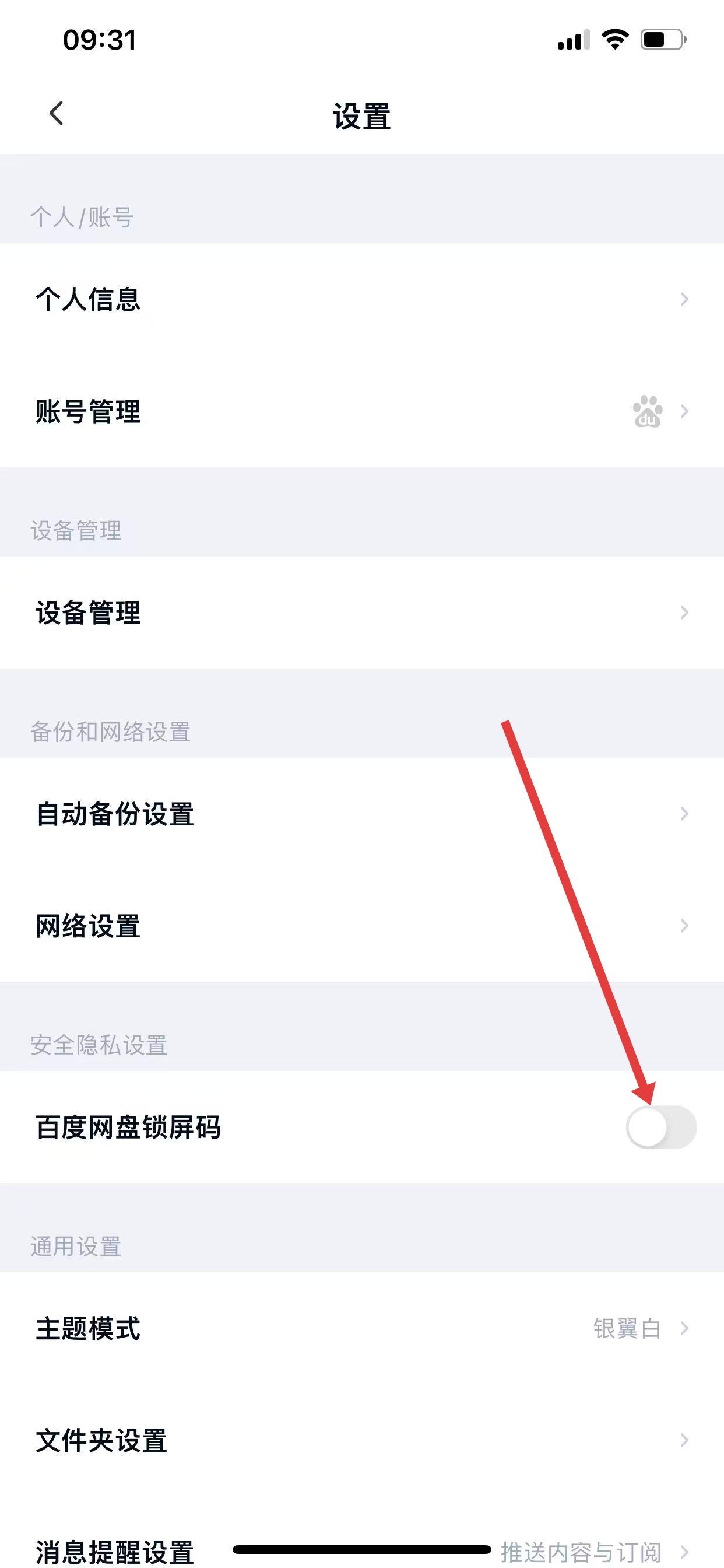 2、在個人界面中,找到并點擊設置選項,找到百度網盤鎖屏碼,點擊其右側的開關按鈕將其開啟。