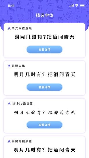 字體設(shè)計(jì)app為大家提供了豐富的字體庫(kù),一般手機(jī)自帶的默認(rèn)字體都比較中規(guī)中矩,大家如果想要更獨(dú)特的字體的話可以下載這個(gè)軟件,里面幾十上百種不同的字體等你來(lái)挑選,能夠提前查看預(yù)覽圖,選定喜歡的就能下載保存到本地啦!