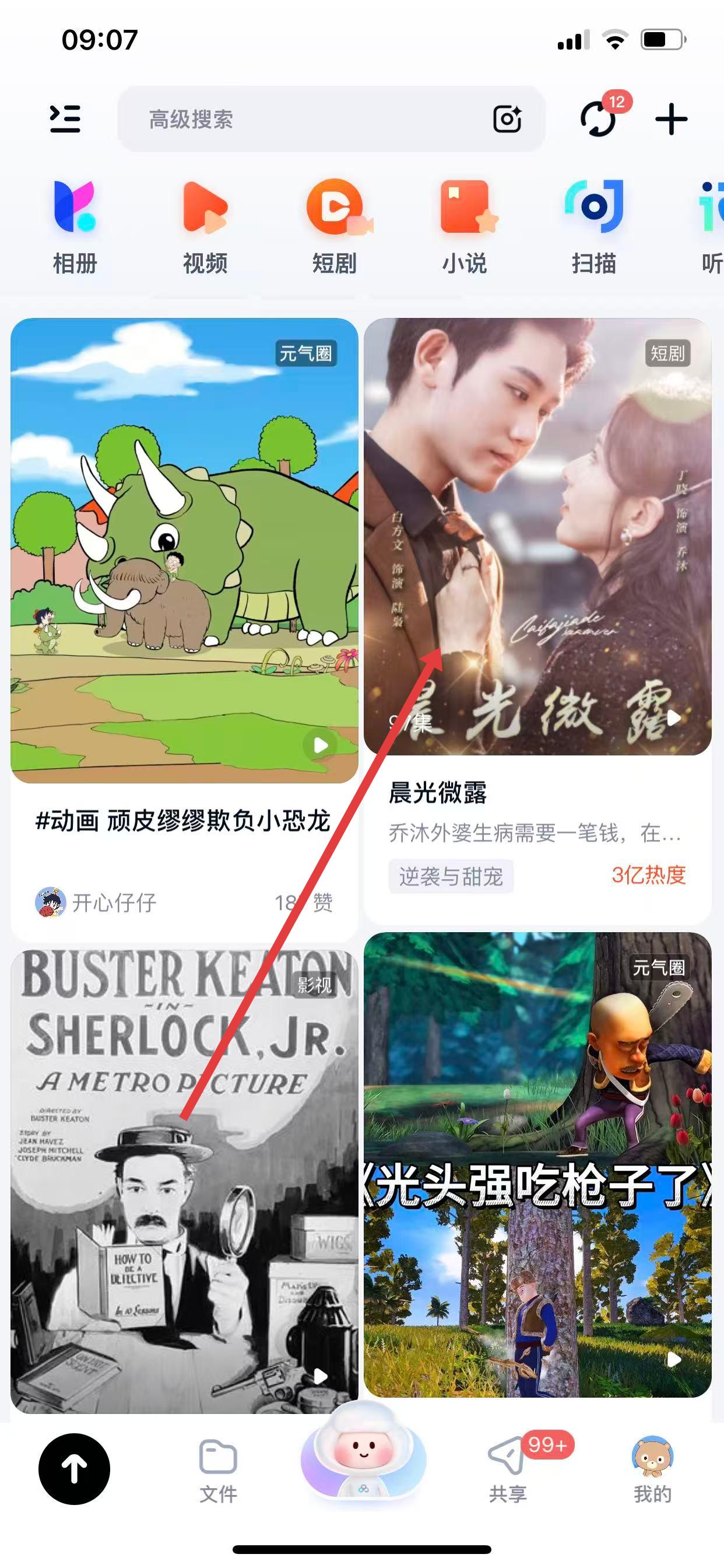 1、打開百度網(wǎng)盤App,進(jìn)入主界面,找到想要觀看的短劇視頻,點(diǎn)擊進(jìn)入播放界面。