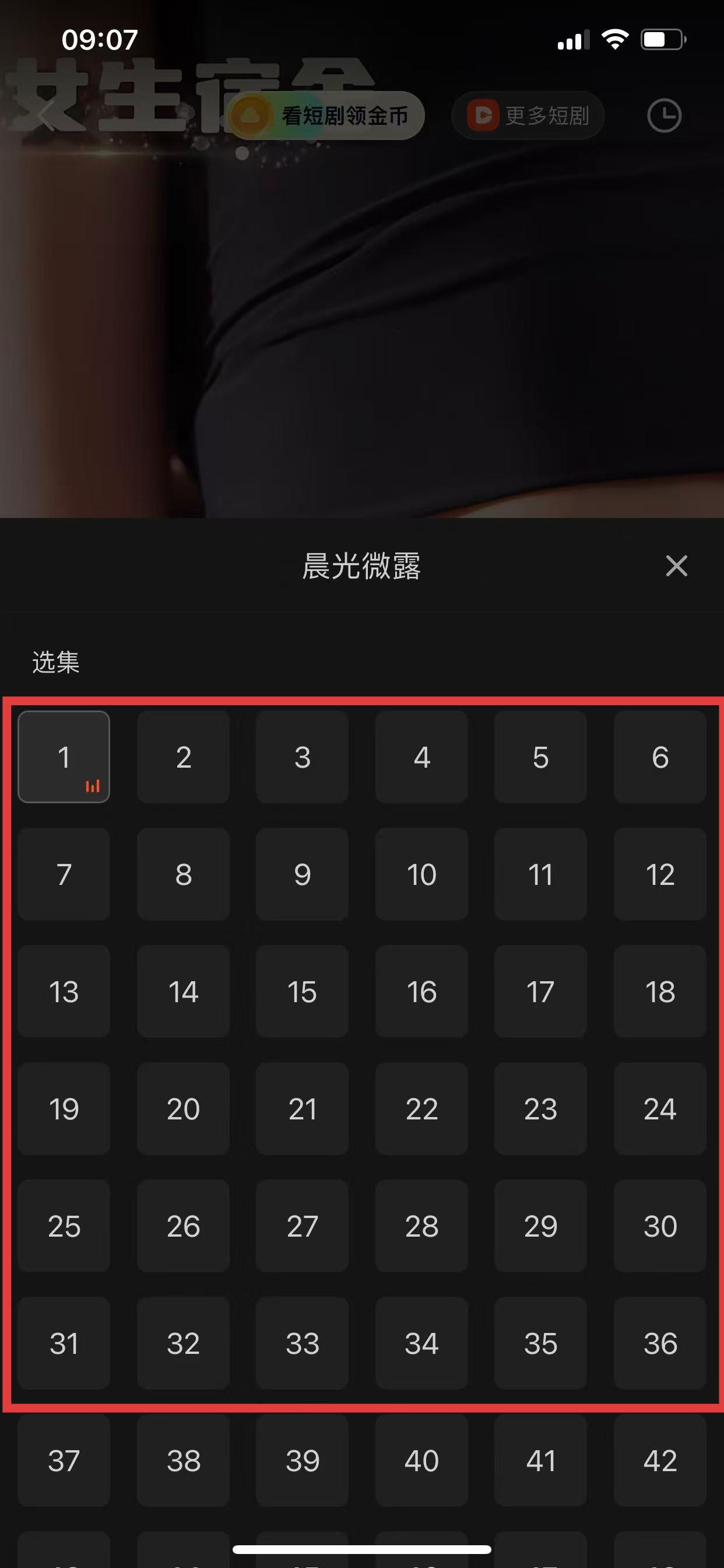 3、點(diǎn)擊后會(huì)彈出選集列表,列表中顯示短劇的各集數(shù),點(diǎn)擊想要觀看的集數(shù),即可跳轉(zhuǎn)播放對應(yīng)劇集。