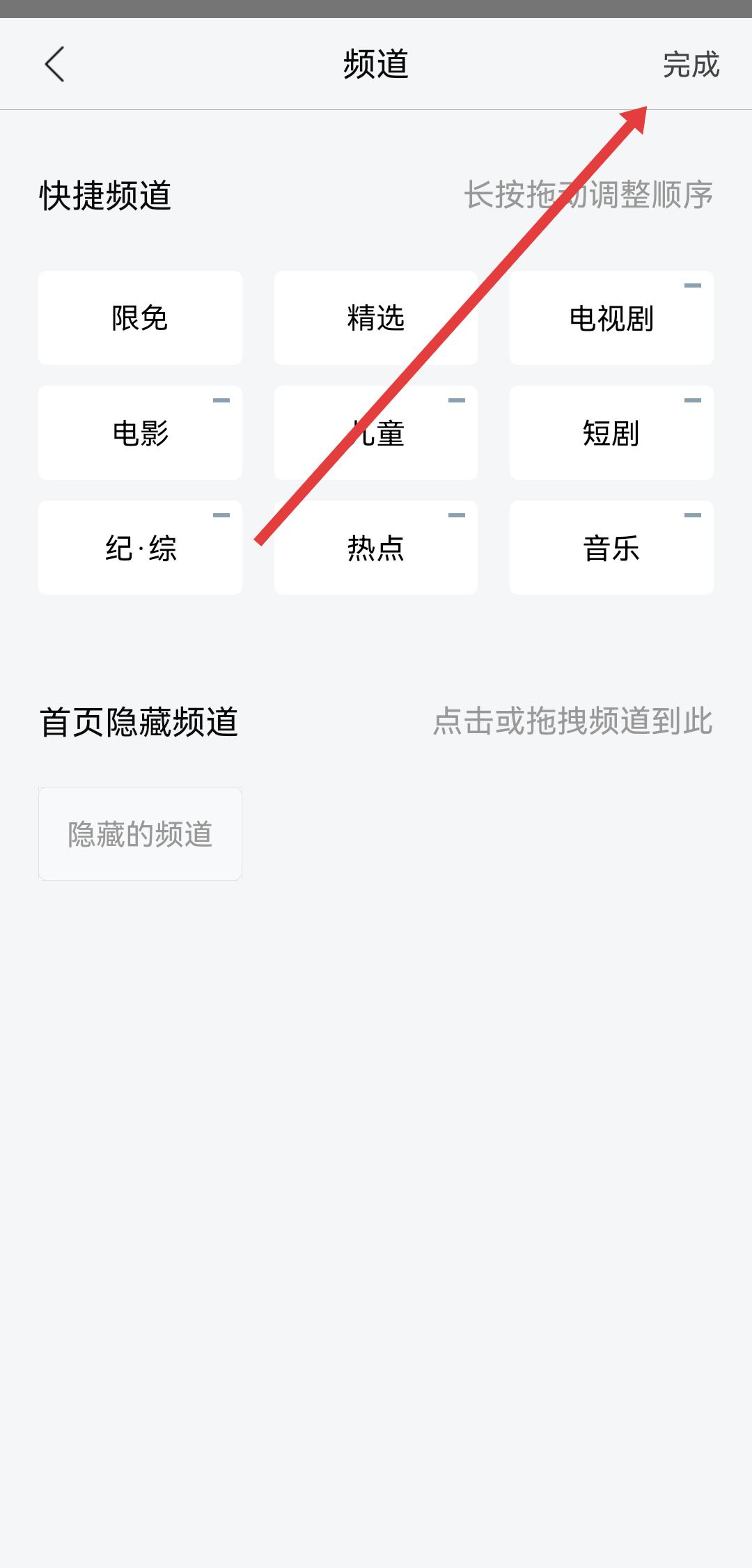 3、根據(jù)自己的觀看習(xí)慣,完成頻道的順序調(diào)整或隱藏設(shè)置后,點(diǎn)擊頁面右上角的完成按鈕,保存編輯操作。