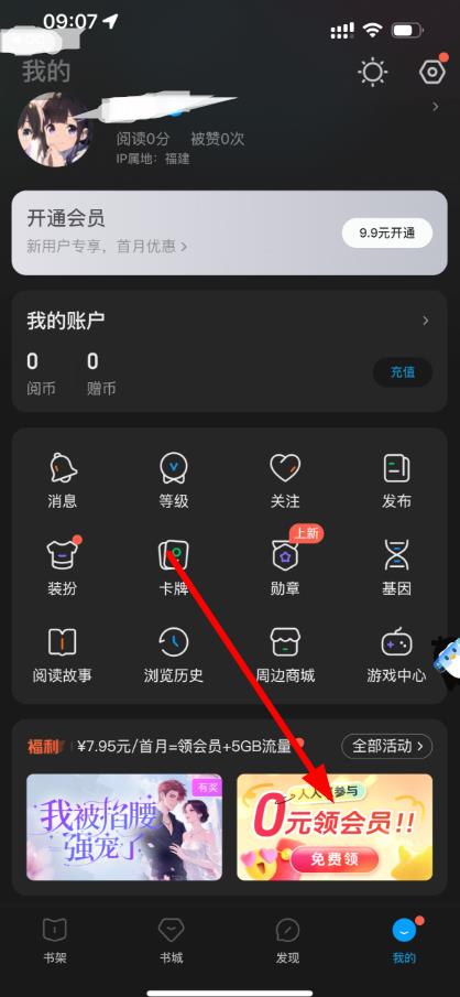 1、打開QQ閱讀,點擊底部導航欄的我的,進入個人中心頁面,找到并點擊0元領會員??!免費領活動入口。