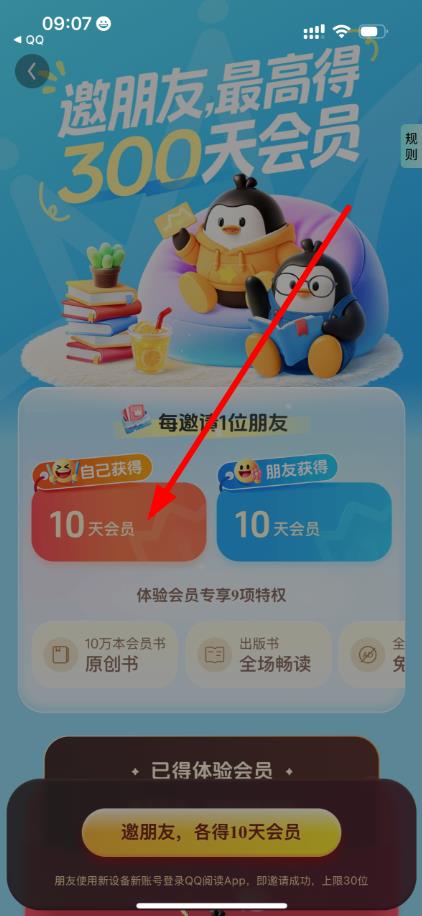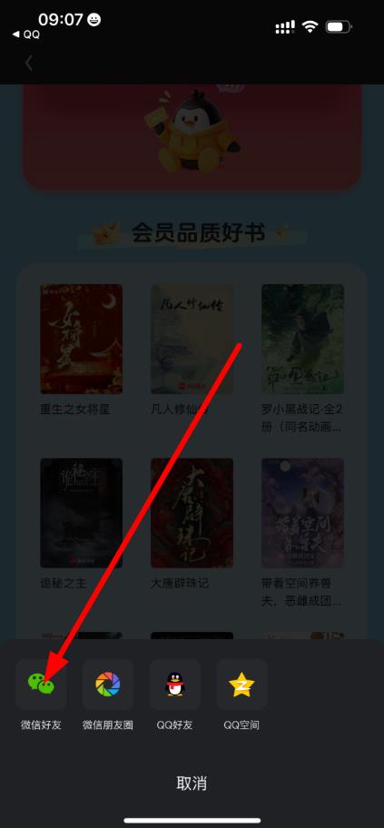 3、點擊邀朋友,各得10天會員按鈕,選擇分享渠道,如微信好友,將活動分享給朋友,朋友使用新設備新賬號登錄QQ閱讀App,即邀請成功可領取10天免費會員。
