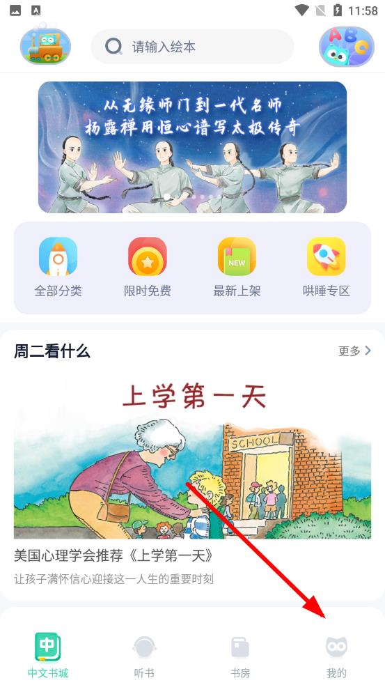 1、打開咿啦看書繪本故事app進入首頁后,點擊屏幕底部導(dǎo)航欄最右側(cè)我的圖標(biāo)進入個人中心。