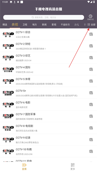 1、打開手機電視高清直播的APP,進入首頁點擊右上全部的按鈕。
