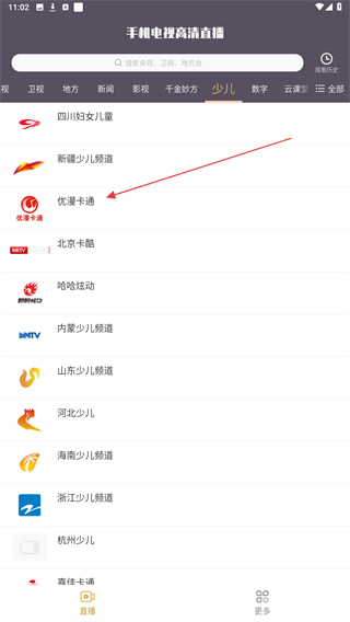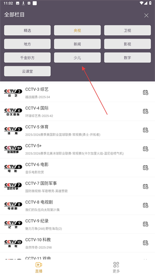 2、在上方彈出的全部欄目中,選擇并點擊少兒頻道的按鈕。