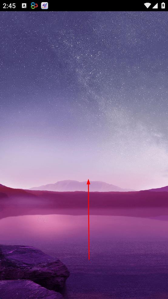 3、進(jìn)入星空湖泊背景的桌面界面后,按照紅色箭頭指示方向,向上滑動(dòng)屏幕,開始探索GO桌面功能 。