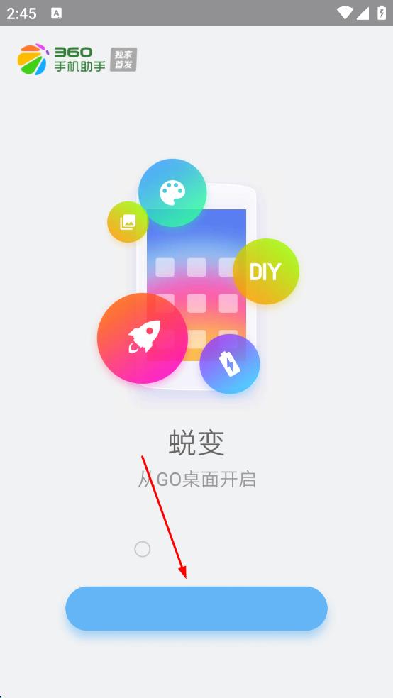 2、在“蛻變 從GO桌面開啟”界面,繼續(xù)點(diǎn)擊底部藍(lán)色按鈕,完成引導(dǎo)步驟,進(jìn)入桌面預(yù)覽階段。