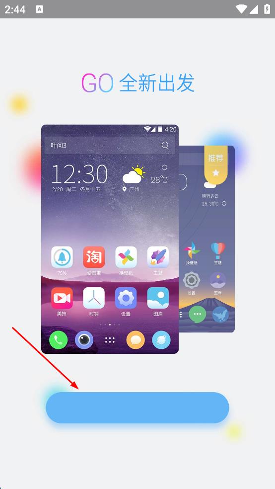 1、打開GO桌面應(yīng)用,看到“GO 全新出發(fā)”界面,點(diǎn)擊底部藍(lán)色按鈕,進(jìn)入下一個(gè)引導(dǎo)頁面。