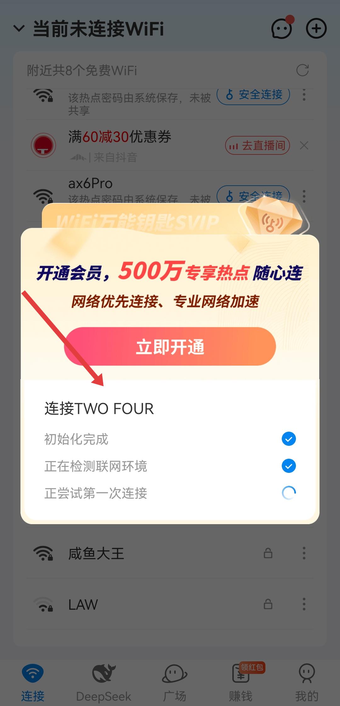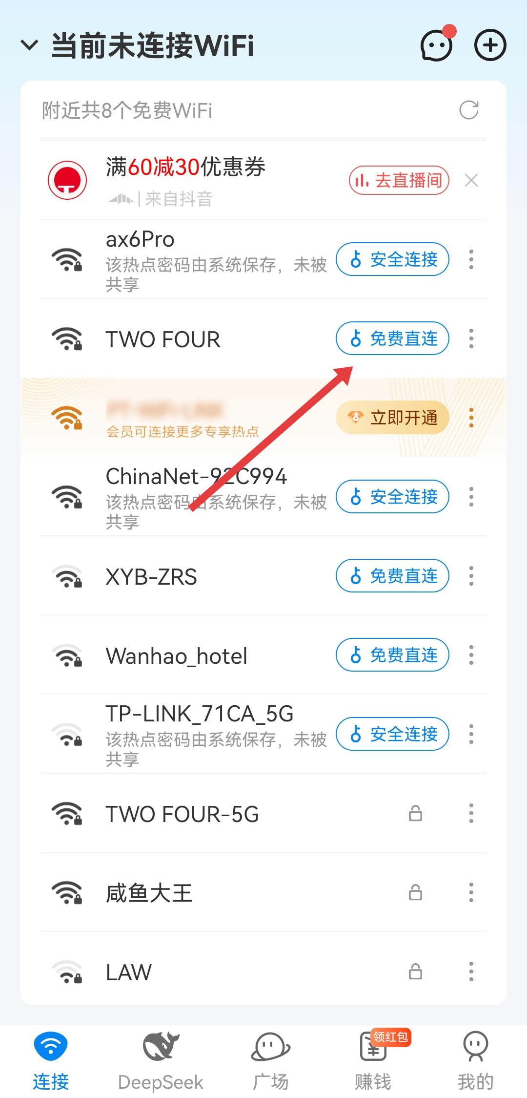 1、打開WiFi萬能鑰匙,在附近WiFi列表里,找到帶有免費(fèi)直連按鈕的WiFi,點(diǎn)擊該按鈕啟動(dòng)連接流程。