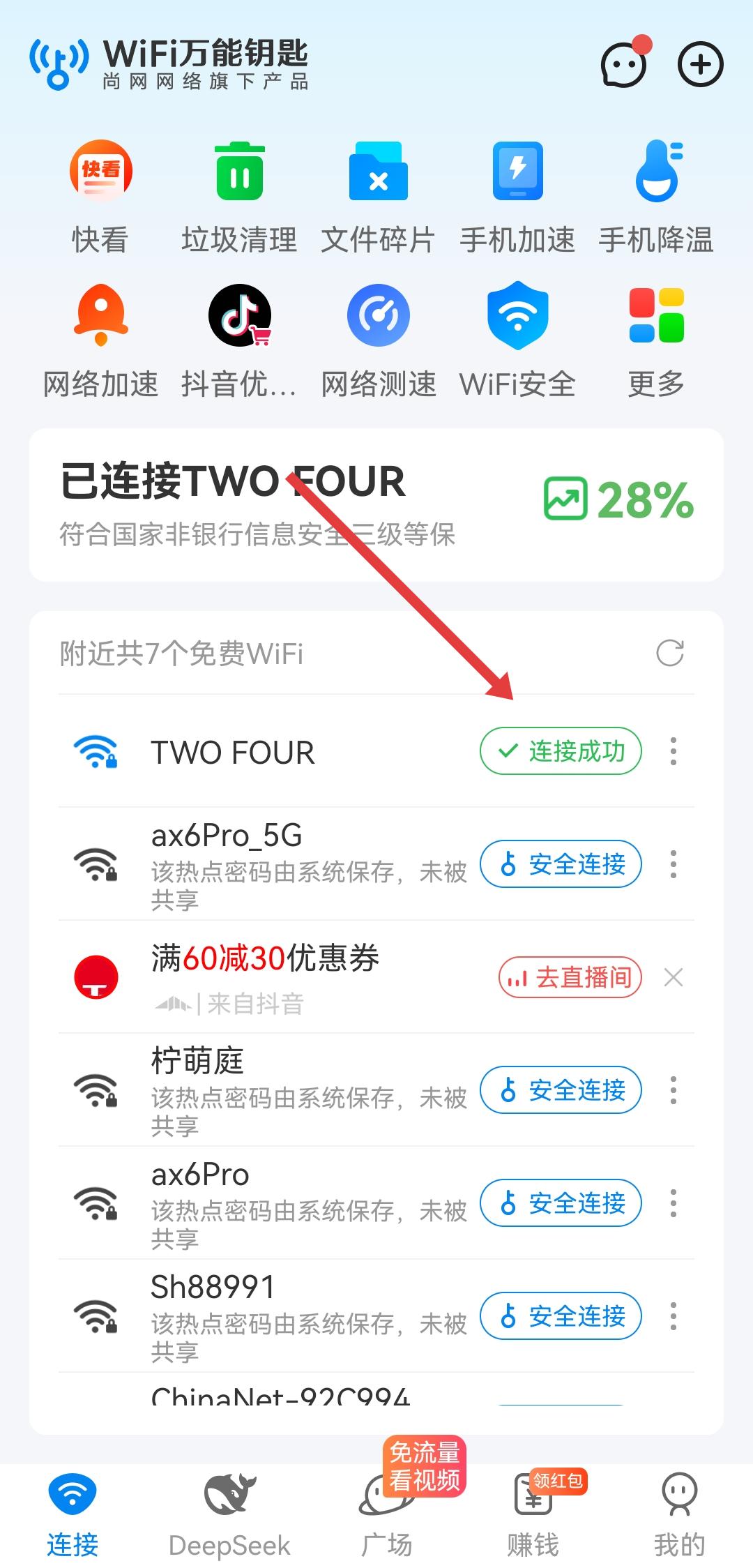 3、當(dāng)主界面對(duì)應(yīng)WiFi旁顯示連接成功時(shí),說明已通過WiFi萬能鑰匙成功連接該網(wǎng)絡(luò),可正常使用網(wǎng)絡(luò)了。