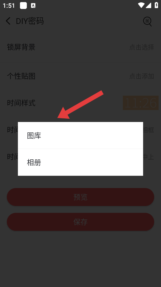 3、在DIY密碼設置界面,點擊鎖屏背景點擊選擇按鈕,觸發(fā)圖片來源選擇彈窗。