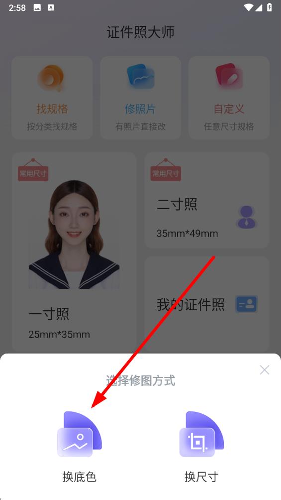 2、點(diǎn)擊換底色選項(xiàng),在相冊選擇需要更換底色的證件照,進(jìn)入更換底色操作。
