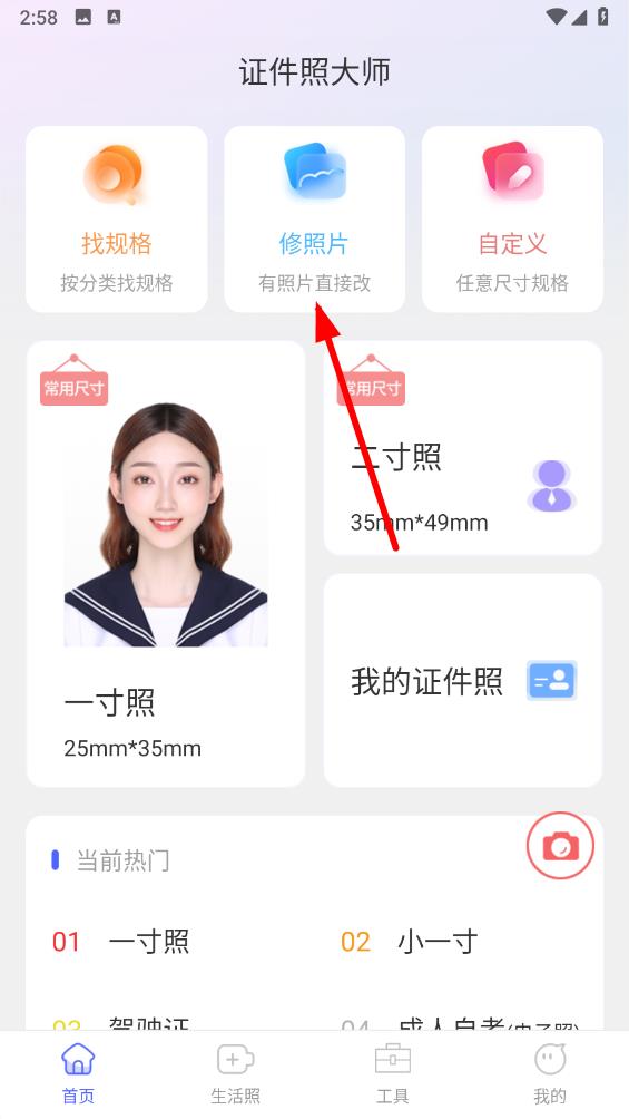 1、打開證件照大師APP,在首頁點(diǎn)擊修照片選項(xiàng),進(jìn)入照片選擇界面。